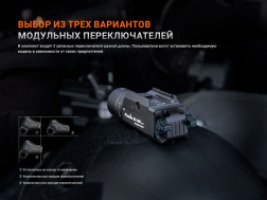 Благодаря двусторонним механическим переключателям управлять работой тактического фонаря можно как правой, так и левой рукой. Для кратковременного включения светодиода необходимо поднять один из переключателей, для включения/выключения освещения — нажать на регулятор вверх/вниз. В комплект входят 2 пары запасных переключателей разной длины, которые пользователь может установить, исходя из личных предпочтений.