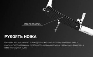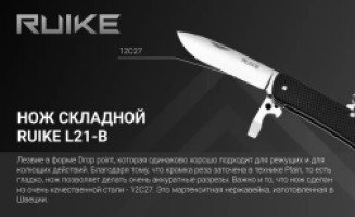 Ruike L21 – это один из складных ножей молодого, но уже хорошо известного бренда Ruike. Он адресован всем активным людям, которые часто выезжают на природу для отдыха или занятий спортом. Главным преимуществом данной модели является компактность, которая совершенно не снижает практичность ножа. Ruike L21 наделен 12 функциями, которые детально описаны в инструкции, составленной производителями. Но все же, его главным инструментом является именно нож. Длина лезвия складного ножа составляет 85 мм. Оно имеет форму drop-point – универсальную разновидность, которая позволяет одинаково легко резать ножом и колоть. К тому же, заточено лезвие тоже универсальным способом – ровно по всей его длине. Толщина клинка Ruike L21 составляет 3 мм. Нож сделан из стали 12С27, которая относится к числу нержавеющих сплавов. Этот тщательно сбалансированный металл характеризуется большой твердостью (до 59 HRC), что позволяет ножам долго оставаться острыми даже при интенсивном использовании. Из такого же металла сделаны и все другие инструменты данной модели. Из спинки рукоятки достается штопор, а параллельно ножу размещен многофункциональный инструмент с функциями плоской отвертки, открывалки для бутылок, приспособлениями для зачистки проводов разного диаметра. Как и лезвие ножа, этот инструмент достается при помощи насечки на стальной пластине, которую можно поддеть ногтем. Помимо этого, с обратно1 стороны рукоятки достается инструмент для разрезания ремней и строп, который также может послужить маленькой прямой отверткой. В торцевую часть рукоятки встроено небольшое поворотное кольцо, в которое можно продеть темляк. Кроме того, здесь же находится стеклобой. Рядом с последними двумя инструментами хранится пинцет, который плотно размещается внутри рукоятки, однако может использоваться как совершенно самостоятельный инструмент.