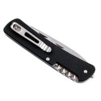 Однако владельцы модели Ruike L42 в любой момент могут воспользоваться не только ножом. Помимо этого к их услугам также обширный комплект дополнительных инструментов. Рядом с ножом помещаются ножницы уменьшенного размера, пила по дереву, открывалка для бутылок, небольшая отвертка с прямым шлицем шириною 6,5 мм, два приспособления для снятия изоляции с проводов. С противоположной стороны рукоятки таким же образом достается широкое шило с ушком для нитки и еще двумя приспособлениями для зачистки проводов. Непосредственно в торцевой части встроен стеклобой и можно достать металлическое кольцо, к которому крепится темляк. Также здесь размещаются щипцы, которые, в отличие от всех прочих инструментов, можно использовать отдельно от ножа. А на верхней стороне рукоятки располагается штопор.