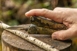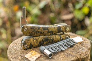 Особенность Ganzo 2016-P — пластиковые накладки на рукоятках с камуфляжным принтом. Кроме интересного окраса мультитул получает практичное свойство скрытого ношения, что удобно во время охоты или выполнения тактических операций. Рукоятки плотно лежат в ладони, а насечки на боковых частях предотвращают скольжение мультитула даже при работе мокрыми руками.