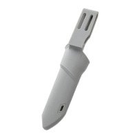 В изготовлении рукоятки применен материал PP+TRP. Этот материал представляет собой сочетание синтетического полипропилена и прорезиненного покрытия. Сочетание этих материалов известны своей износостойкостью и хорошим сопротивлением к воздействию температур. Рукоятка имеет ребристую поверхность, благодаря чему она не скользит в руке, даже при длительном применении. В рукоятку встроена выемка для темляка и добавлены насечки перед частью с лезвием для удобного расположения большого пальца. Ножны также изготовлены из полипропилена, только без добавления резины.