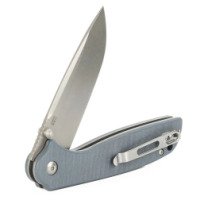 Рукоять модели изготовлена с применением стеклотекстолита G10. Высокопрочный материал гарантирует удобство при использовании ножа и его устойчивость к разного рода внешним воздействиям. Рукоять эргономичной формы, комфортная при захвате. Поверхность рукоятки текстурированная, благодаря чему нож надёжно удерживается в руке при любых условиях. Металлическая клипса позволяет фиксировать изделие, и носить его на кармане, на поясе либо прикреплять к сумке. Предусмотрено отверстие для темляка.
