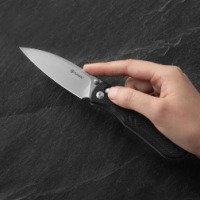Нож имеет компактные и сбалансированные размеры: общая длина составляет 200 мм, длина лезвия — 88 мм. Клинок Drop Point подходит для точных резов и колющих работ, а также может использоваться для резки жестких материалов. Длинная режущая кромка обеспечивает хороший контроль. Вес ножа — 103,3 г, что делает его легким для постоянного ношения.