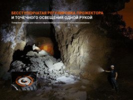 Для управления освещением в фонаре предусмотрены электронный выключатель и тумблер с поворотом на 270°. С помощью электронной кнопки пользователь может выбирать один из 7 режимов освещения. Тумблер настраивает фокусировку луча, позволяя плавно менять освещение с рассеянного (прожектор) на точечное.