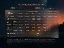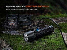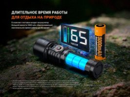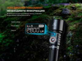 Над тумблером на корпусе фонаря расположен OLED-экран. На нем отображается вся необходимая информация — яркость, уровень заряда аккумулятора и выбранный режим работы. В комплект поставки входит аккумулятор ARB-L21-5000 емкостью 5000 мАч, который обеспечивает максимальное время работы до 65 часов. Порт USB Type-C обеспечивает быструю и удобную зарядку фонаря.