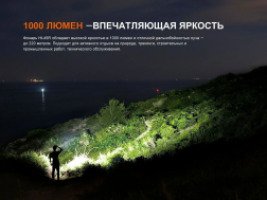 В LED фонаре установлен мощный светодиод холодного белого света Luminus SFT25R и красный светодиод OSRAM GR QSSPA1.23. Срок службы каждого из них составляет 50 000 часов. Максимальная яркость туристического фонаря достигает 1000 люмен, а максимальная дальнобойность луча — 220 метров.