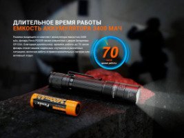 Фонарем можно управлять с помощью бесшумного переключателя в хвостовой части. Кнопка отвечает сразу за несколько функций: включение, выключение, режим стробоскопа и четыре уровня яркости. В комплекте с фонарем поставляется перезаряжаемый аккумулятор емкостью 3400 мАч, обеспечивающий до 70 часов работы. Также фонарь питается от двух морозостойких батареек CR123A. Благодаря чему фонарь подходит для применения в условиях низких температур и на большой высоте.