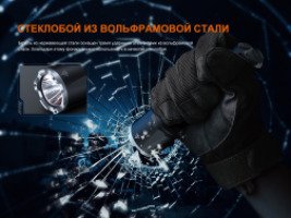 Дополнительно высокомощный светодиодный фонарь оснащен стальным безелем с шипами из вольфрамовой стали. Благодаря такой конструкции фонарь можно использовать в качестве стеклобоя.