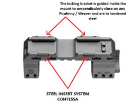 Contessa Ultra Tactical изготовлен из высококачественного алюминиевого сплава 7075, а крепёжные элементы выполнены из легированной стали с применением технологии Contessa Steel Insert System, что гарантирует стабильность и прецизионную точность сохранения выверки после снятия-установки кронштейна. Кольца не закрывают барабанчики ввода поправок и линию горизонта для удобства стрельбы.