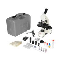 Монокулярный биологический микроскоп. Увеличение от 40х до 2000х, максимальное до 4000х. Наблюдения в проходящем и отраженном свете. Револьверное устройство на 4 объектива. Грубая и тонкая фокусировка со шкалой 1 мкм. Механический двухкоординатный столик. Питание от сети или от батарей. В комплекте жесткий кейс и мини-лаборатория с препаратами и принадлежностями.