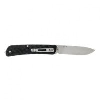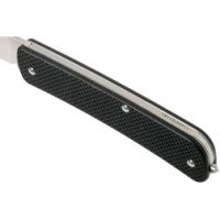 Рукоятка сформирована из стальной базы и двух накладок из композитного материала (его название – G10). Она может быть любого из трех цветов: черная, коричневая или зеленая. Чтобы нож не проскальзывал в ладонях, накладки сделаны текстурированными. С одной стороны прикручена стальная клипса, которая позволяет крепить нож на ремне.