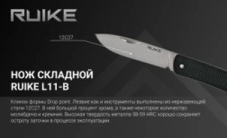 Открывается Ruike L11 вручную, при помощи насечки на клинке, которую следует поддеть ногтем. Жесткой фиксации лезвия в этой модели не предусмотрено, и нож держится открытым за счет скользящего соединения Slip joint. Вес этой складной модели составляет всего 84,5 грамма.