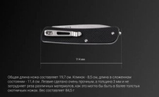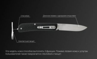 Нож Ruike L11 отличается от многих других складных моделей компактностью, которая совершенно не идет в ущерб его практичности. Наоборот, данная модель даже снабжена дополнительными инструментами, которые расширяют его базовую функциональность. Помимо лезвия ножа к услугам пользователей также предлагается стеклобой и пинцет. Стеклобой представляет собою небольшой стальной наконечник, который встроен в торец рукоятки ножа. Пинцет хранится внутри рукоятки и достается из нее, когда возникает необходимость в использовании этого инструмента.