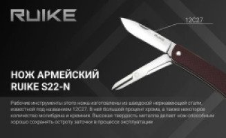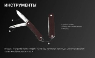 Ruike S22 ориентирован на очень широкий круг задач. Это складной нож небольшого размера, который дополнен кольцом для ношения на цепочке и миниатюрной версией ножниц. В пользу выбора именно этой модели говорит как небольшой вес и габариты ножа, так и его долговечность за счет качественных материалов, из которых сделаны все его детали. Рабочие инструменты этого ножа изготовлены из шведской нержавеющей стали, известной под названием 12С27. В ней большой процент хрома, а также некоторое количество молибдена и кремния. Такой состав делает сплав отлично сбалансированным. К тому же, при температуре -80 °C сталь закалена до твердости 57-59 HRC. Высокая твердость металла делает нож способным хорошо сохранять остроту заточки в процессе эксплуатации.