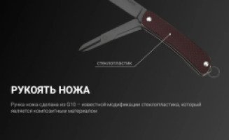 Рукоятка этого складного ножа сделана из качественного стеклопластика – композитного материала, состоящего из стекловолокна и связующего вещества в виде эпоксидных смол. Цвет рукоятки – коричневый, зеленый или черный. Обе накладки сделаны текстурированными и не скользят в руках. Прижимной клипсы в этой модели нет, так как нож предлагается носить как брелок на цепочке. Для этого в торце его ручки есть небольшое стальное кольцо. В сложенном виде Ruike S22 имеет длину 71 мм. Его вес – 43 грамма.