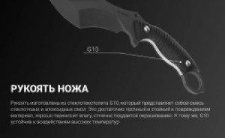 Рукоять изготовлена из стеклотекстолита G10, который представляет собой смесь стеклоткани и эпоксидных смол. Это достаточно прочный и стойкий к повреждениям материал, хорошо переносит влагу, отлично поддаётся окрашиванию. К тому же, G10 устойчив к воздействиям высоких температур. Рукоять с таким материалом в составе будет иметь долгий срок службы и хорошо противостоять влиянию различных факторов.