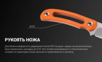 Та же пластина стали, из которой сделан клинок, формирует и основу рукоятки ножа. Однако для более комфортного удержания Hornet F815 в руках, сверху на металлическую базу прикручены накладки из G10. Это особая разновидность стеклопластика, которая по характеристикам прочности приближается к металлу. Тем не менее, как и обычный пластик, G10 – очень легкий материал, которому так же просто придать нужную форму на этапе производства. Поверхность обеих накладок по всей площади сделана текстурированной, а потому нож не скользит в руках, даже если они мокрые. В центре рукоятки имеется большое сквозное отверстие, за счет которого вес модели Hornet F815 существенно уменьшен.