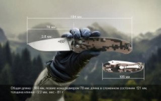 Вес новинки 81 грамм, общая длина составляет 18,4 сантиметра. Длина лезвия 7,8 сантиметра, толщина клинка 2,2 миллиметра. В качестве механизма безопасности используется замок Axis lock. Помогает удерживать лезвие как в открытом, так и в закрытом состоянии. Нож дополнен металлической клипсой, прочной и жесткой, изготовленной из закаленной нержавеющей стали. Позволяет зафиксировать нож на одежде либо на снаряжении. Клинок имеет ровную матовую поверхность, устойчивую к возникновению царапин и потертостей.