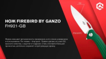 Складной флиппер Ganzo Firebird FH921 представляет собой нож карманного формата, может быть использован в туризме. Специфика данной модели – в необычной форме ручки, которая имеет выемку в верхней части ближе к обуху. Насечки на обухе обеспечивают прекрасное сцепление с пальцем пользователя. Другая черта ножа – отверстие в области клинка на месте, где обычно располагается шпенёк. Конструктивный элемент помогает запросто открывать модель буквально одной рукой. Осевой винт обеспечен круглым металлическим подшипником.