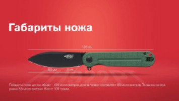 Размеры Firebird by Ganzo FH922PT-GB D2 Steel Green: длина общая достигает 196 миллиметров, длина лезвия составляет 86 миллиметров. Толщина клинка равна трём с половиной миллиметрам. Весит 109 грамм.