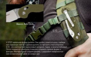 Нож D727 - прочный, не прихотлив в уходе, практичен в использовании. Теперь нож Ganzo стал еще совершеннее за счет использования стали D2 и добавления подшипников в механизм замка типа Axis-lock. Этот замок обеспечивает легкое открытие и закрытие лезвия, его надежную фиксацию. Подшипники добавили плавности ходу клинка и повысили износоустойчивость механизма.