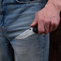 При изготовлении рукоятки ножа применен ABS-пластик, который ценится за термостойкость и устойчивость к агрессивным химическим веществам. Рукоятка ножа, как нельзя кстати, вписывается в дизайн данной модели, что делает изделие еще более привлекательным. На рукоятке имеется удобное крепление – клипса, что позволяет закрепить нож на ремне, в кармане или на экипировке. Текстурирование, нанесенное на рукоять, обеспечивает ее удобное и надежное расположение в руке, даже при экстремальных условиях эксплуатации.