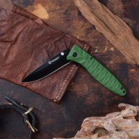 Рукоятка ножа сделана из распространенного материала – высокотехнологичного, термостойкого и нетоксичного ABS-пластика, достоинствами которого являются почти нулевая подверженность воздействию агрессивных веществ и термостойкость. Рукоятка по бокам имеет рифленые пластины, которые позволяют удобно расположить нож в руке и не испытывать дискомфорта при любых погодных условиях. Во время транспортировки нож можно разместить на ремне, используя для этого специально предусмотренную производителем металлическую клипсу.