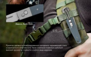 Рукоятка сделана из комбинированного материала: нержавеющей стали и композитного пластика G10. Такое сочетание позволило добиться высокой прочности, стойкости к любого вида коррозии.