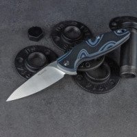 Рукоятка ножа Ruike Fang P105-Q сформирована за счет двух стеклопластиковых накладок (G10). Они надежно прикручены к основанию из стали несколькими болтами. Цвет ручки – комбинированный, с цветными разводами синего или серого цвета. Для указательного пальца сделана довольно глубокая выемка снизу, которая не дает ладони проскальзывать по рукоятке во время работы. Препятствует скольжению и неровная за счет особой накатки поверхность ручки ножа. Для страховки во время ношения Fang P105 в кармане, к ножу можно прикрепить темляк. Также есть стальная клипса на одной из сторон рукоятки.