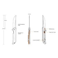 Вес модели составляет 110 грамм, в длину нож достигает 21,5 сантиметра. Толщина клинка – три с половиной миллиметра. В качестве материала рукоятки был использован TC4 (titanium). Твердость металла достигает 58-60 единиц Роквелла, что является хорошим показателем для такого типа инструментов. Нож представлен в двух цветах, сером и серебристом.