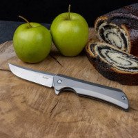 Новый ножик – это складной туристический экземпляр, который без труда поместится в кармане, сумке или рюкзаке. Тип заточки – прямой. Форма лезвия – normal blade. Это универсальный, классический профиль, который в народе зовется «финка». Сейчас такая форма является самой популярной разновидностью клинка. Длина лезвия 9,2 сантиметра, клинок сделан из нержавеющей стали марки S35VN. Данный металлический сплав являет собой улучшенную версию CPM S30V. Ножи из подобной стали характеризуются более высокими показателями вязкости при ударных нагрузках, а также легче поддаются полировке во время изготовления.