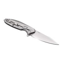 На рукоятке уже прикручена клипса, которая нужна, чтобы нож можно было носить прямо на ремне. Ее положение фиксированное. Также с той стороны, где прикручена клипса, хорошо видно, что часть рукоятки одновременно является прижимной пластиной в замке Frame Lock. Это модифицированный блокирующий механизм, который нужен для регулировки положения клинка. Пластина упирается в пятку лезвия, не давая ему сложиться во время работы с ножом. Это делает эксплуатацию ножа P128-SF практически полностью безопасной. Производители предусмотрели даже дополнительный фиксирующий механизм - Beta Plus, что делает данную модель гораздо более надежной даже по сравнению со многими хорошо известными своим высоким качеством моделями.
