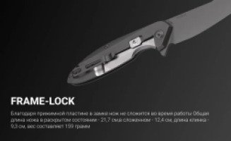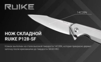 Ножи бренда Ruike очень удачно объединяют современный дизайн с классической надежностью этих инструментов. Они изготовлены из очень надежных материалов, а все детали выполнены аккуратно и точно. Не удивительно, что модель P128-SF за короткое время после появления на рынке, приобрела большую популярность. Лезвие данного ножа имеет необычную форму и напоминает одновременно drop-point и классическую финку. Режущая кромка сделана гладко заточенной и завершается острием, которое помогает делать действительно точные разрезы. Длина клинка P128-SF составляет 93 мм, тем не менее, данная модель не входит в категорию холодного оружия, в подтверждение чего имеется соответствующий сертификат. Толщина клинка этого складного ножа достигает 3,5 мм. Лезвие не только отлично служит своему владельцу, но и требует совершенно простого ухода за собою, ведь сделано оно из нержавеющей стали. Производители специально взяли сплав высокой твердости 14C28N, который прекрасно держит заточку после криозакалки до твердости 58-60 HRC. Еще одной узнаваемой ертой данной модели является то, что лезвие сделано практически матовым за счет особой шлифовки металла. Эта техника называется Bead Blasted и подразумевает использование мелких стеклянных шариков, которые, ударяясь о поверхность металла, оставляют на ней микро следы, которые в итоге и дают матовый эффект. Криообработка позволяет достичь повышения твердости, износостойкости и прочности клинка.