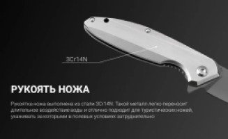 Рукоятка ножа P128-SF также металлическая и выполнена в том же стиле за счет использования шлифовки Bead Blasted. Но металл для ручки использован другой – сталь 3Cr14N. Это немного более мягкая нержавейка, защищенность от коррозии у которой выражена лучше, чем у стали для клинка. Такой металл легко переносит длительное воздействие воды и отлично подходит для туристических ножей, ухаживать за которыми в полевых условиях затруднительно.