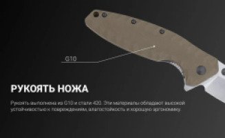 Ручка экземпляра сделана с использованием стеклотекстолита G10. Это не что иное, как сочетание стеклоткани и эпоксидной смолы, с такими качествами, как прочность, ударостойкость и влагонепроницаемость. Кроме того, материал замечательно поддается окрашиванию. Ножи с подобным компонентом, пожалуй, самые надежные и безопасные при удержании в руке. Также рукоятка дополнена нержавеющей сталью 420.
