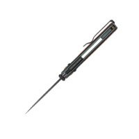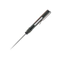 Клинок длиной 81 мм выполнен из нержавеющей стали Sandvik 14C28N с твёрдостью 57–59 HRC, что обеспечивает оптимальное удержание кромки и стойкость к коррозии. Форма клинка — обратный танто (Wharncliffe) — подходит для точных резов. Толщина обуха 2,6 мм сохраняет прочность, а черное покрытие PVD придаёт клинку тактический внешний вид и повышает его стойкость к коррозии и износу.