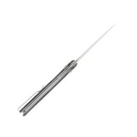 Клинок длиной 92 мм выполнен из нержавеющей стали Sandvik 14C28N с твёрдостью около 57–59 HRC, что обеспечивает хорошую стойкость к коррозии и удержание режущей кромки, а пескоструйная финишная обработка придаёт поверхности дополнительную защиту и стильный матовый вид. Форма клинка — классический drop point — универсальна для широкого круга задач в быту и на природе.
