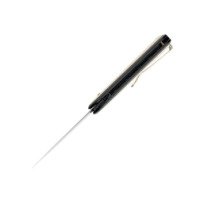 Нож SRM оснащён фиксатором Ambi-Lock (crossbar lock), который надёжно фиксирует клинок в открытом положении и обеспечивает безопасное закрытие. Поворотный механизм с керамическими шарикоподшипниками позволяет плавно открывать и закрывать нож, а прочная конструкция уменьшает люфт в оси. Нож с клипсой имеет углублённую карманную клипсу tip-up для правой руки, что делает его удобным при ношении в кармане.