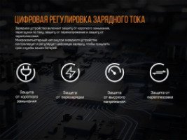 Одновременно можно подзарядить 2 элемента питания любого типа. Каждый из 2 слотов FenixARE-D2 работает независимо от другого. При этом, F самостоятельно определит, какой именно аккумулятор установлен в слот, и какая программа зарядки для него подойдет. Пользователь же в течение 8 секунд после подключения зарядного устройства к питанию может выбрать силу тока для зарядки. Для элементов питания Li-ion типа это 0,5А, 1А или 2А. Другим аккумуляторам доступно 2 варианта: 0,5А или 1А.